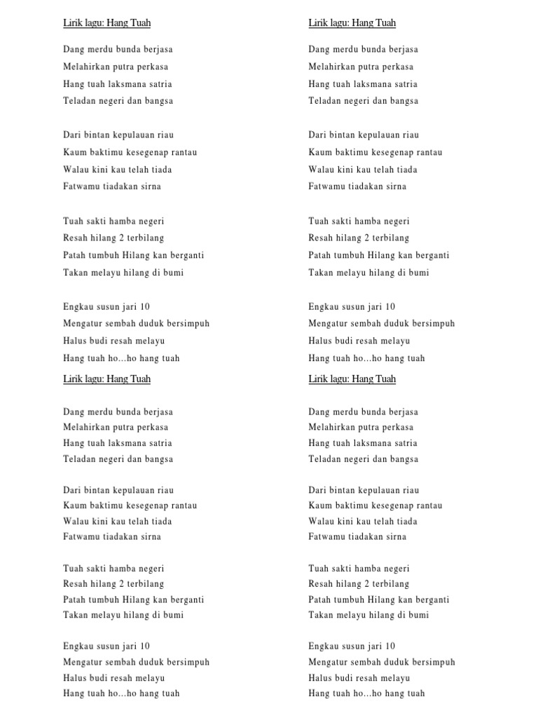 Lirik Lagu Hang Tuah_Iyeth Bustami Tersebut sudah dalam hikayat laksmana Hang Tuah setia amanah menjunjung hasrat juga martabat jangan Melayu dibuang juriat Dang merdu bunda bejasa melahirkan putra perkasa Hang Tuah laksmana satria teladan negri dan bangsa dari Bintan kepulauan Riau. Hang tuah hoho hang tuah. Engkau susun jari 10.